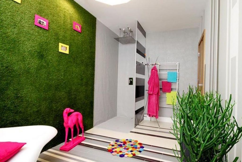 Sogar die Dekoration von Badezimmern wird durch die Präsenz von Kunstrasen an einer ihrer Wände verstärkt.